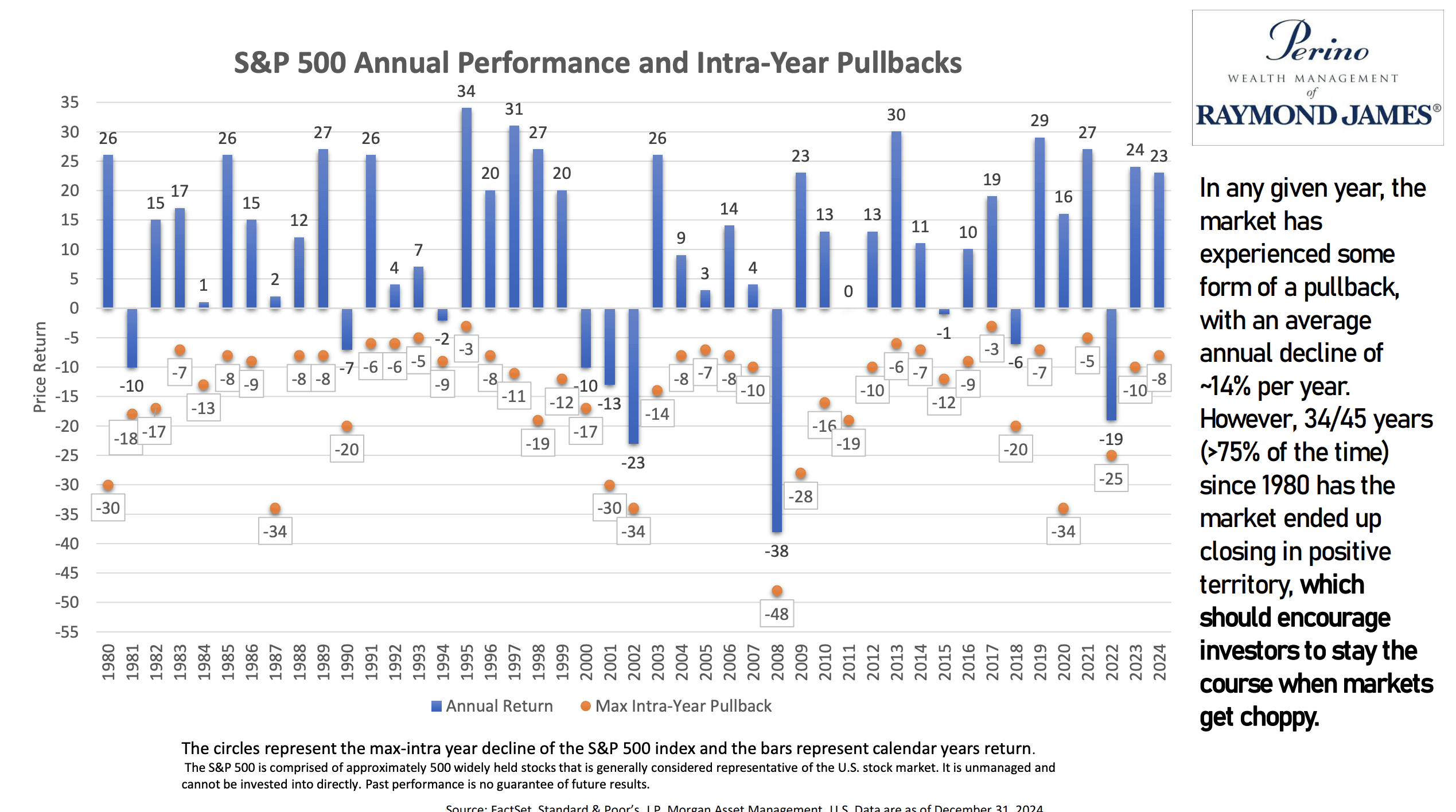 According to data from S&P Dow Jones Indices, the S&P 500 has experienced significant intra-year declines regularly since 1980: