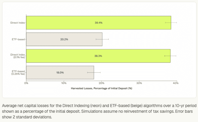 Direct indexing's pitch is simple: harvest losses on individual stocks while maintaining index exposure. Morgan Stanley research puts the benefit at 0.3% to 1.0% annually, though that varies wildly based on market conditions and tax rates. More optimistic simulations comparing S&P 500 direct indexing to SPY show 2%+ annual improvement at the highest tax brackets.