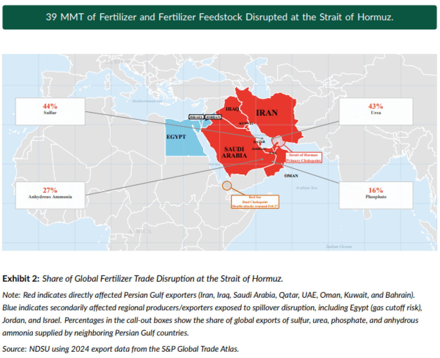 44% of global Sulfur exports and 43% of global Urea exports are channeled through the strait, which makes Hormuz a central artery of the global fertilizer supply chain.